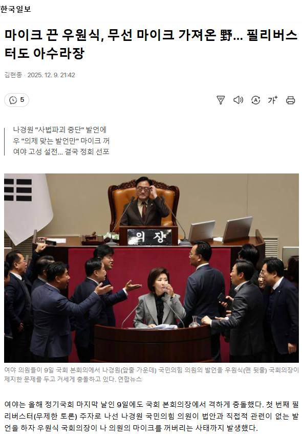 마이크 끈 우원식, 무선 마이크 가져온 野… 필리버스터도 아수라장 ㅡ 오죽하면 그러겠어