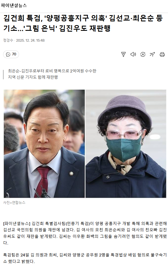 김건희 특검, '양평공흥지구 의혹' 김선교·최은순 등 기소... '그림 은닉' 김진우도 재판행