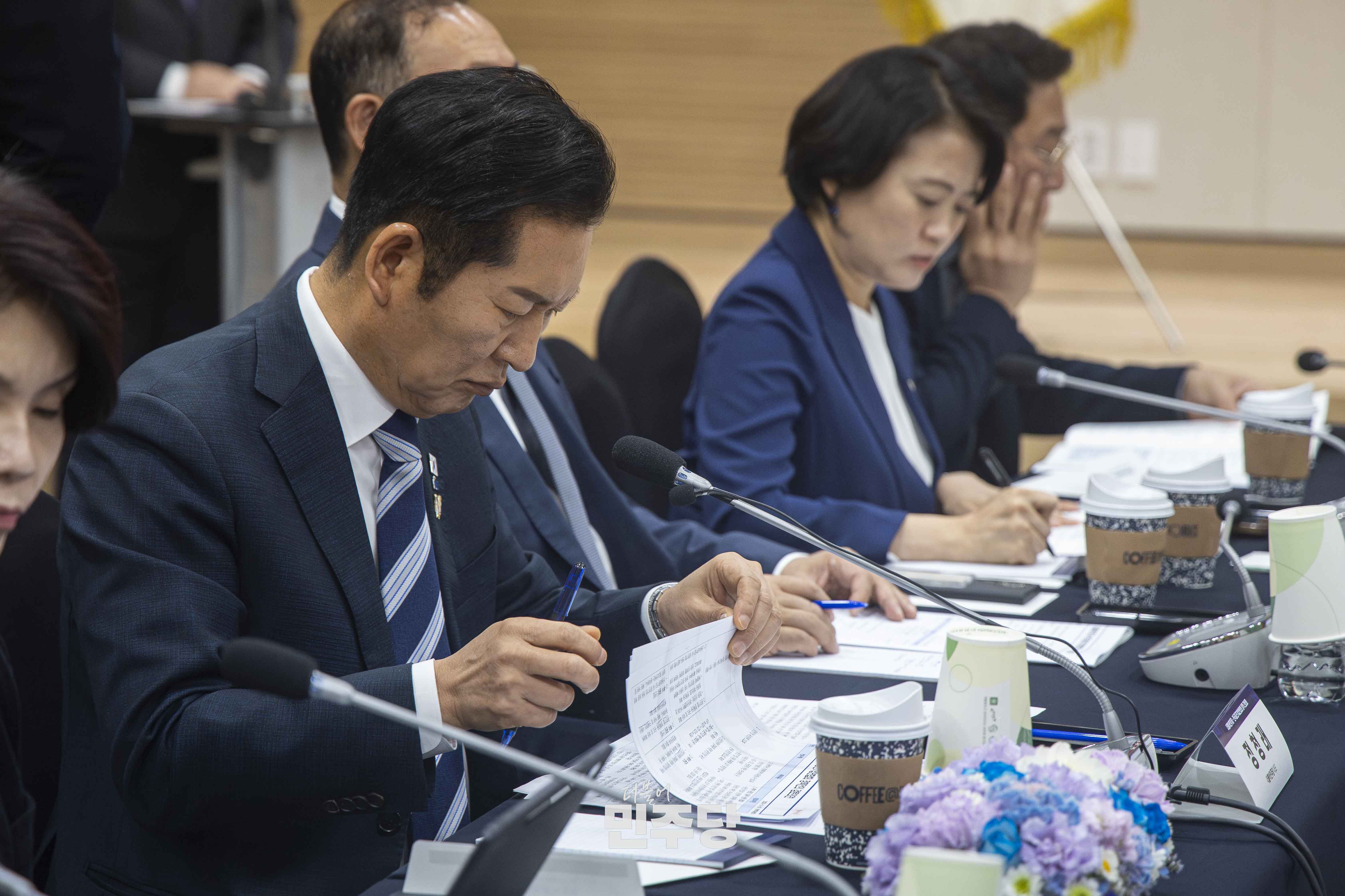 정청래 당대표가 2025.10.22.(수) 국회 본청 당대표회의실에서 열린 더불어민주당 지방선거기획단 3차 회의에 참석하여 모두발언을 하고 있다.