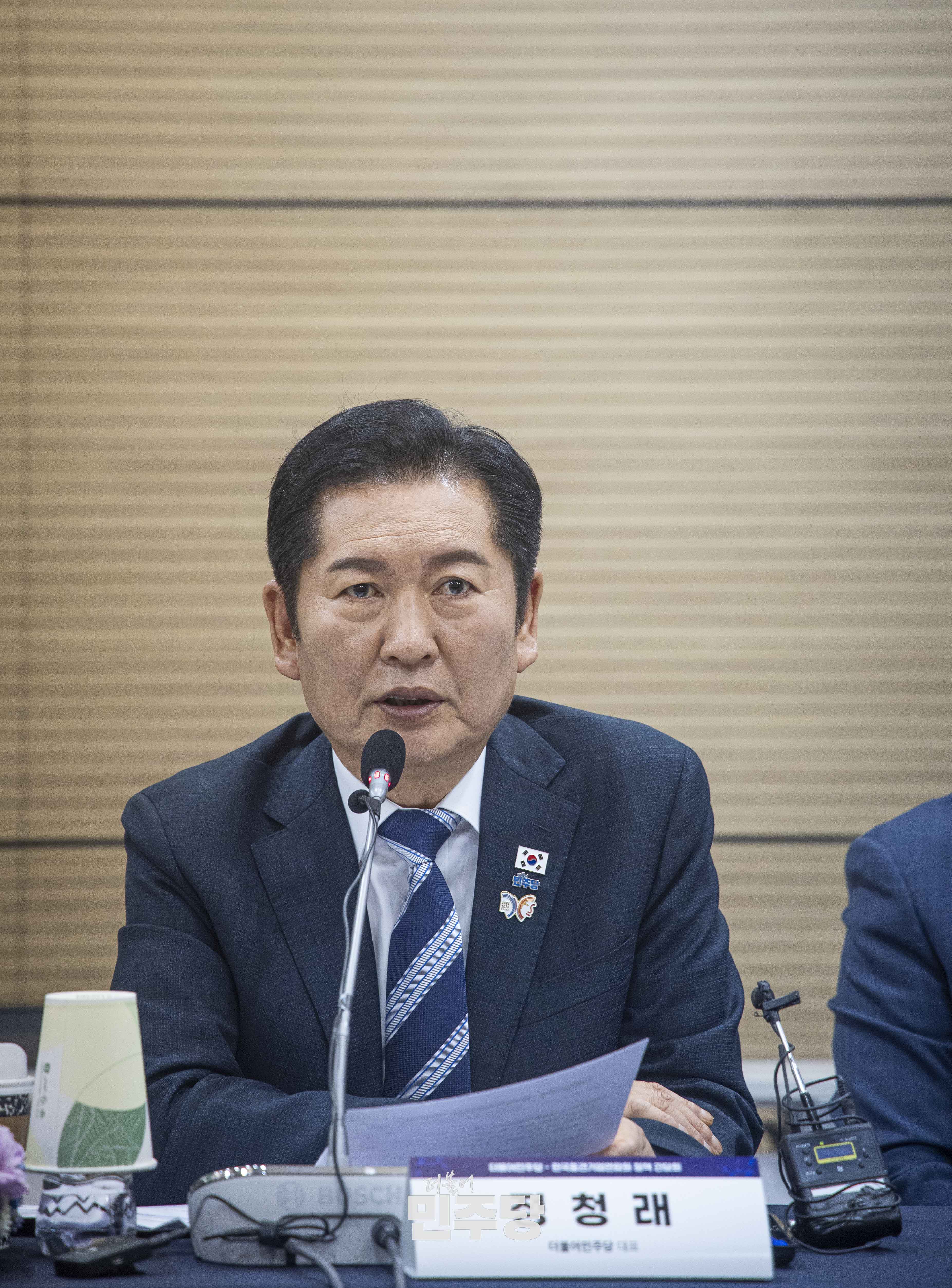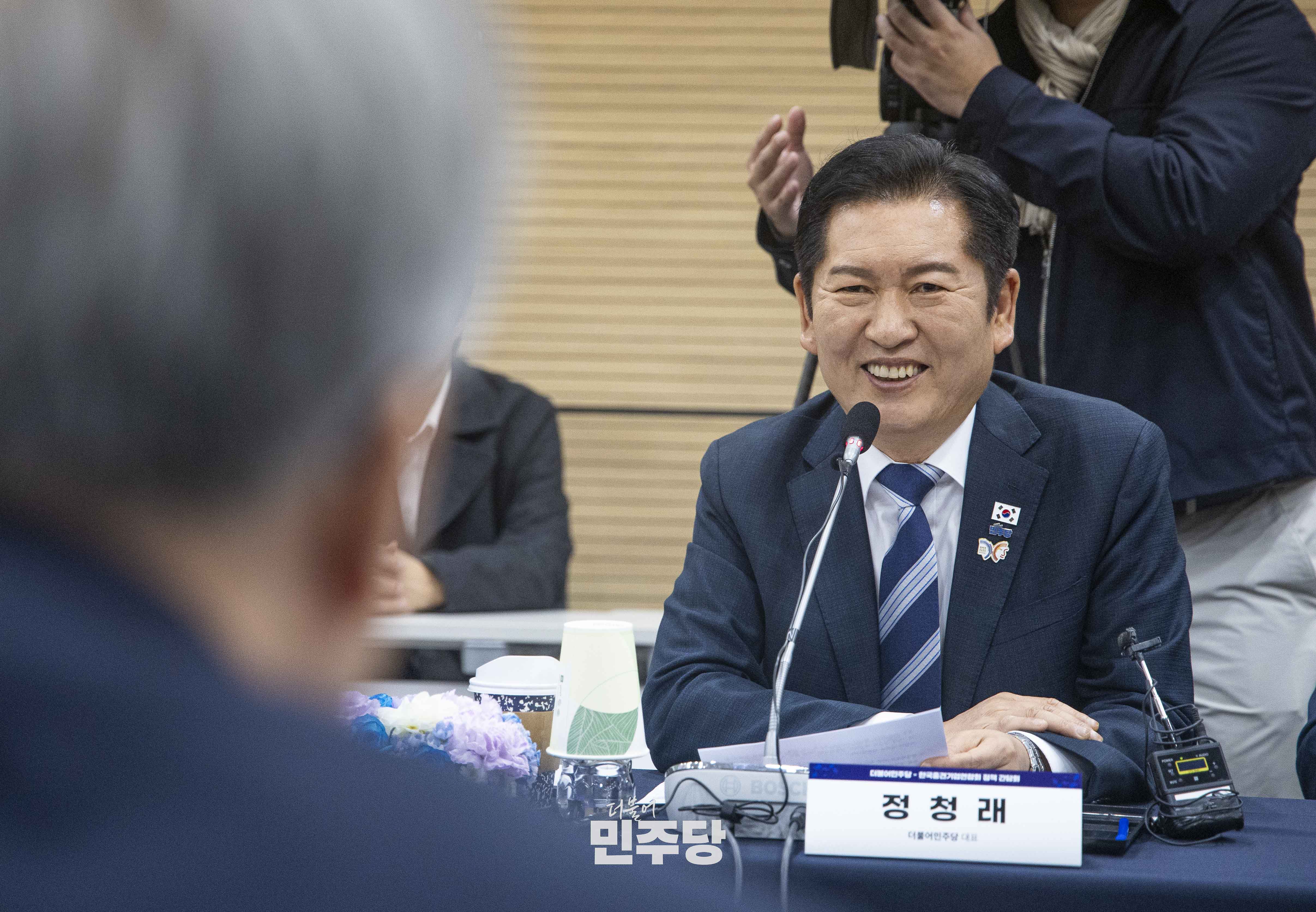 정청래 당대표가 2025.10.31.(금) 서울 마포구에 위치한 상장회사회관에서 진행한 더불어민주당-한국중견기업연합회 정책간담회에 참석하여 기념촬영을 하고 있다.