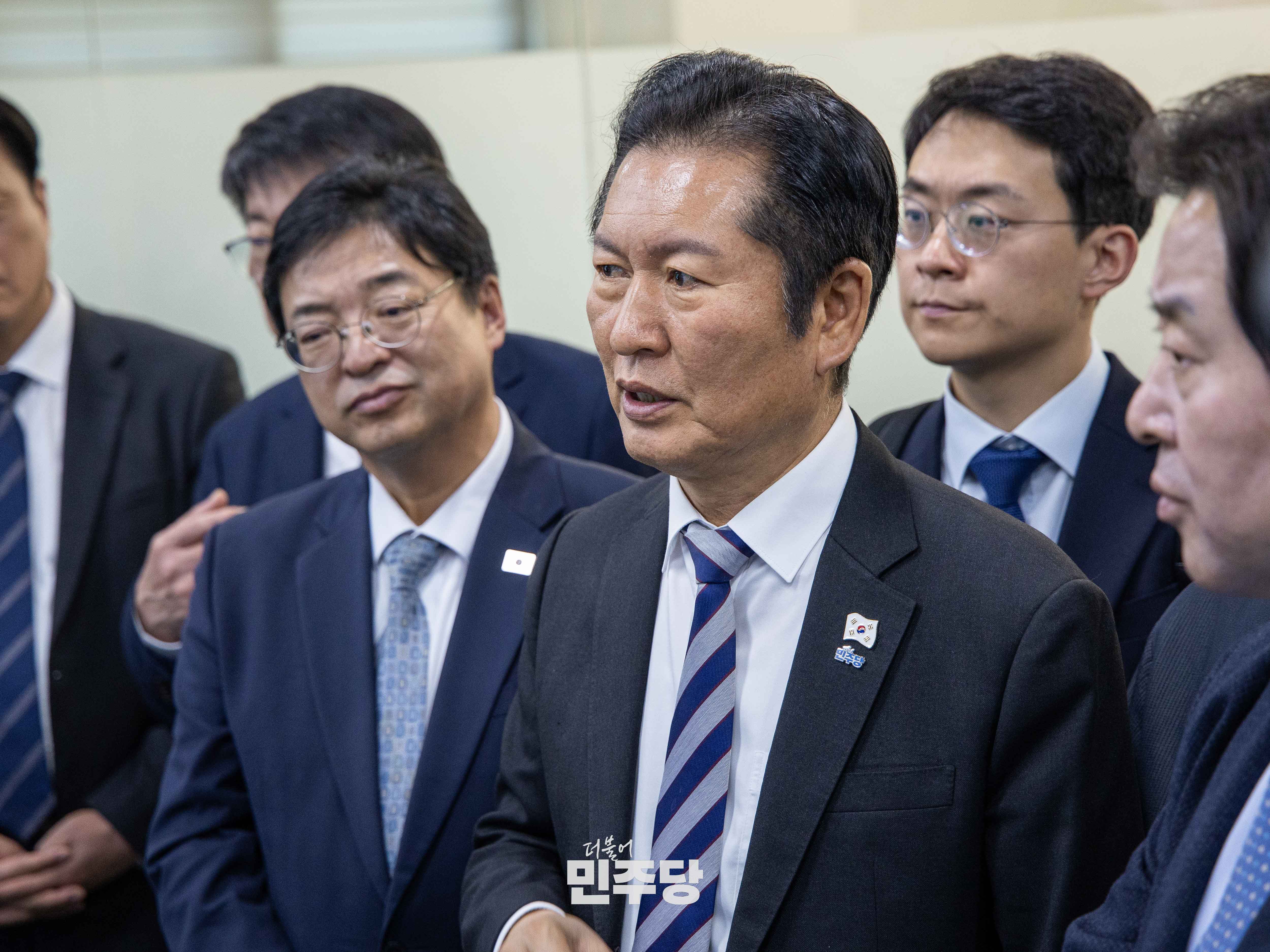 정청래 당대표가 2025.11.20.(목) 국회 본청 당대표회의실에서 열린 호남발전과제 보고회에 참석하여 기념촬영을 하고 있다.