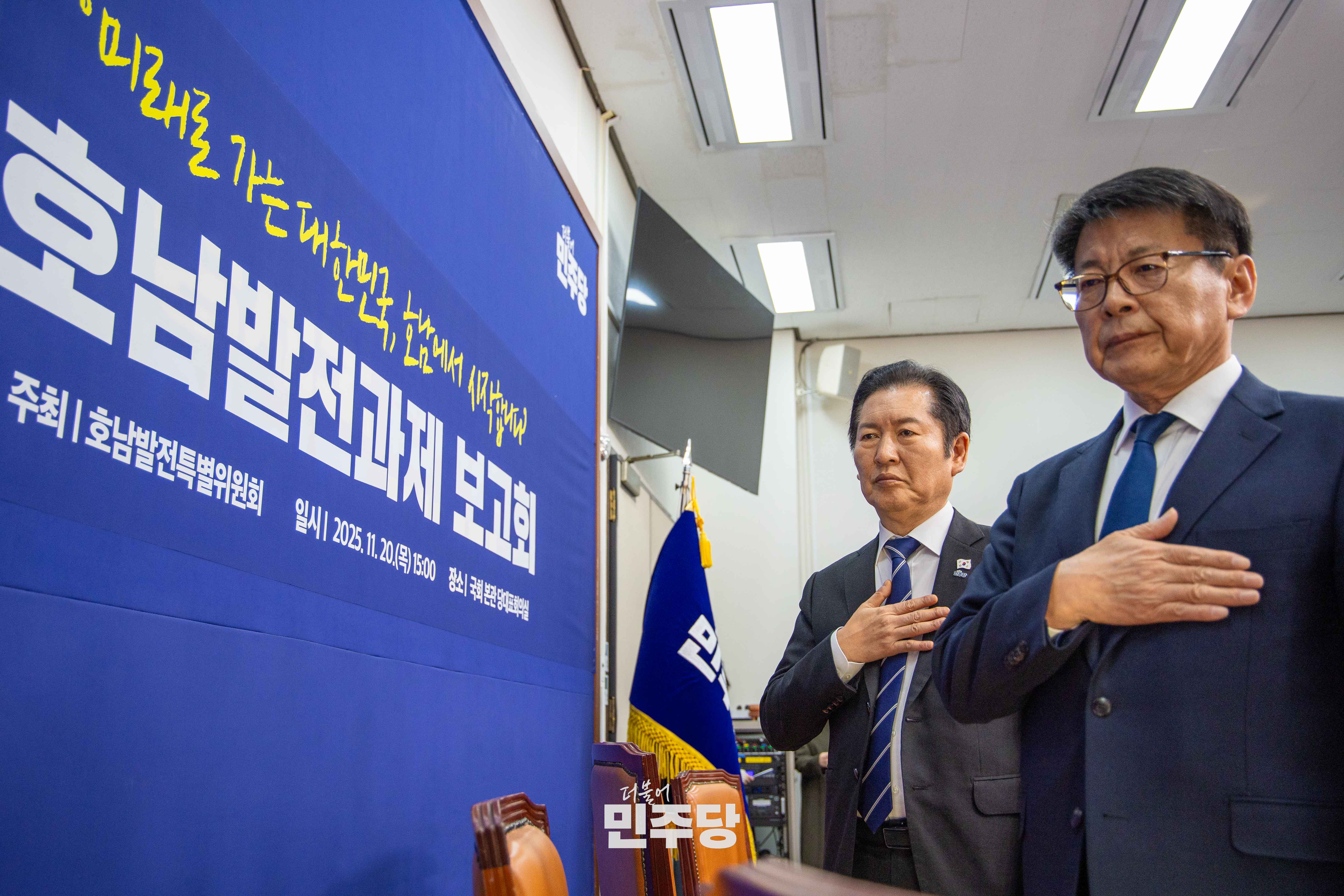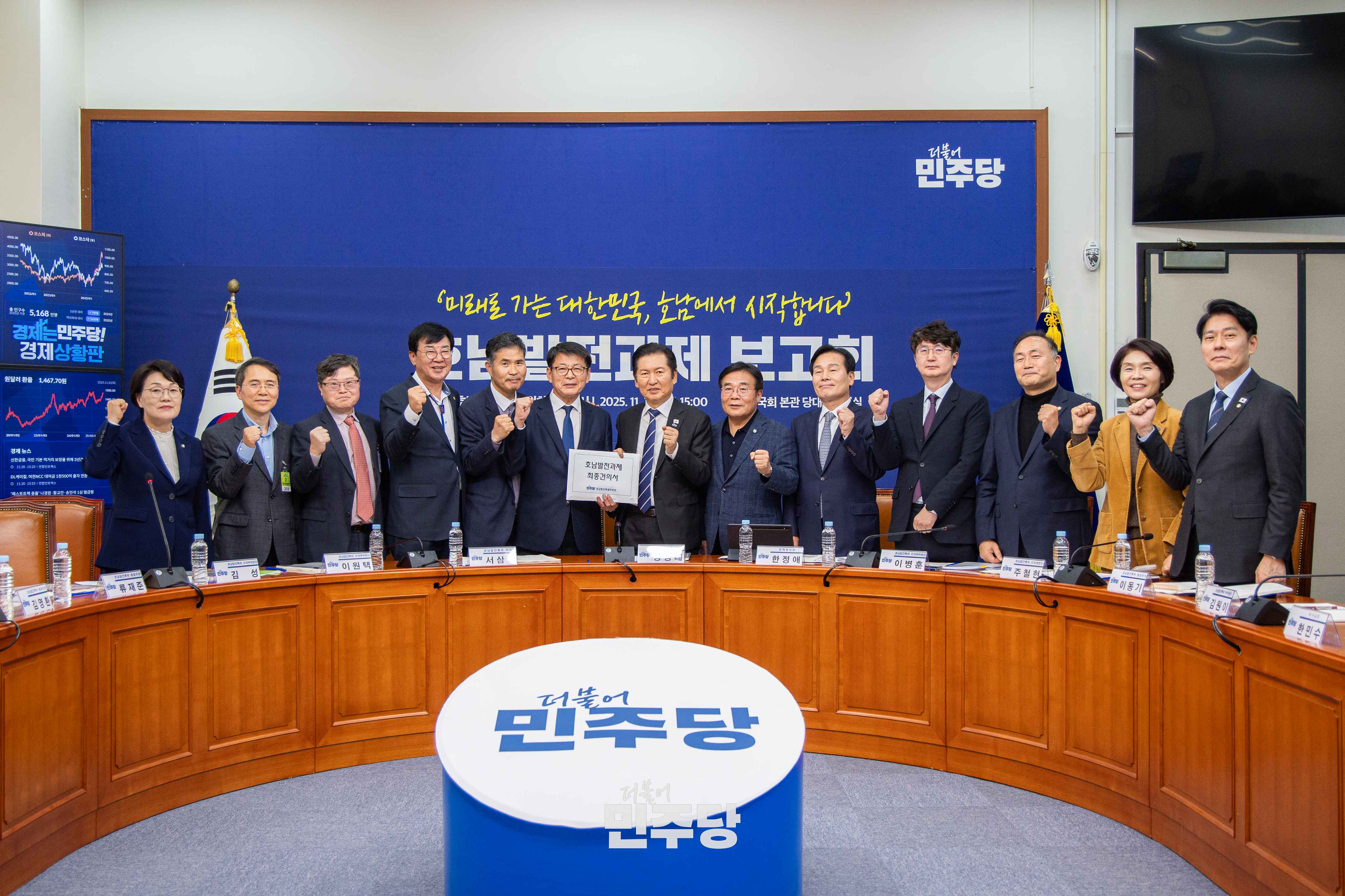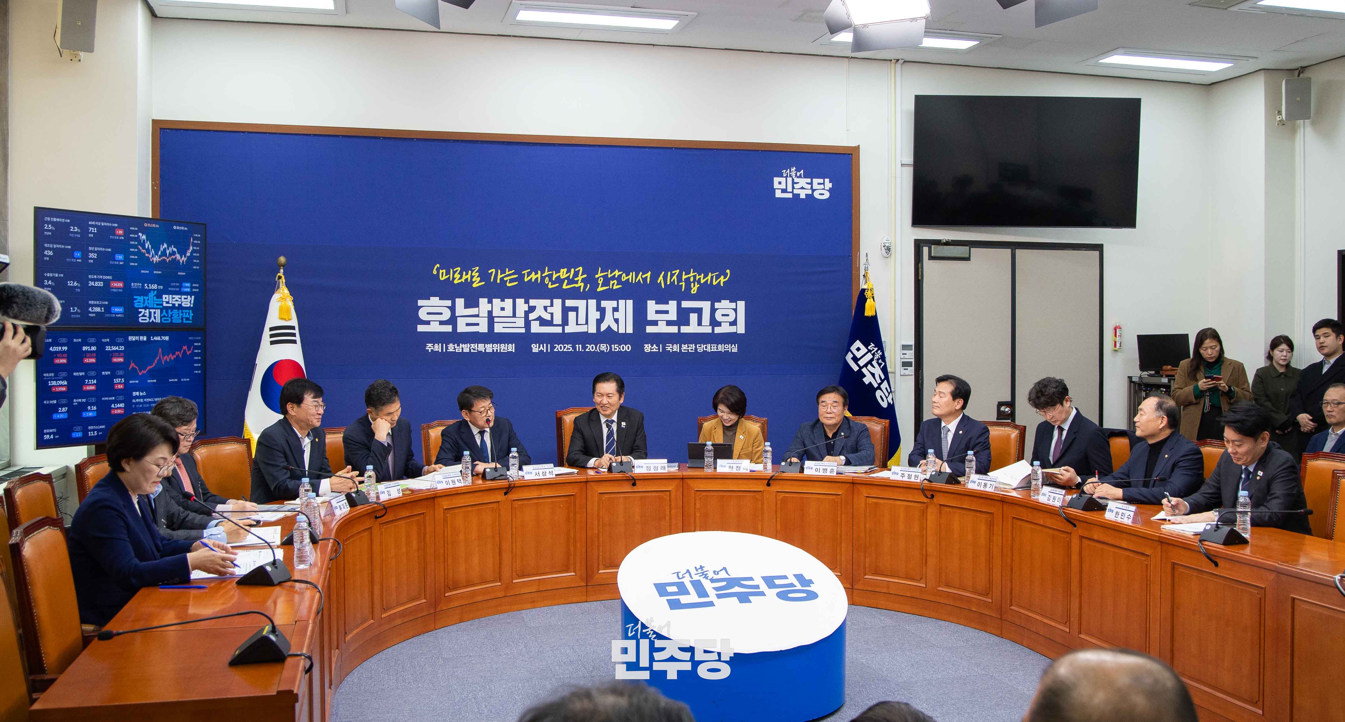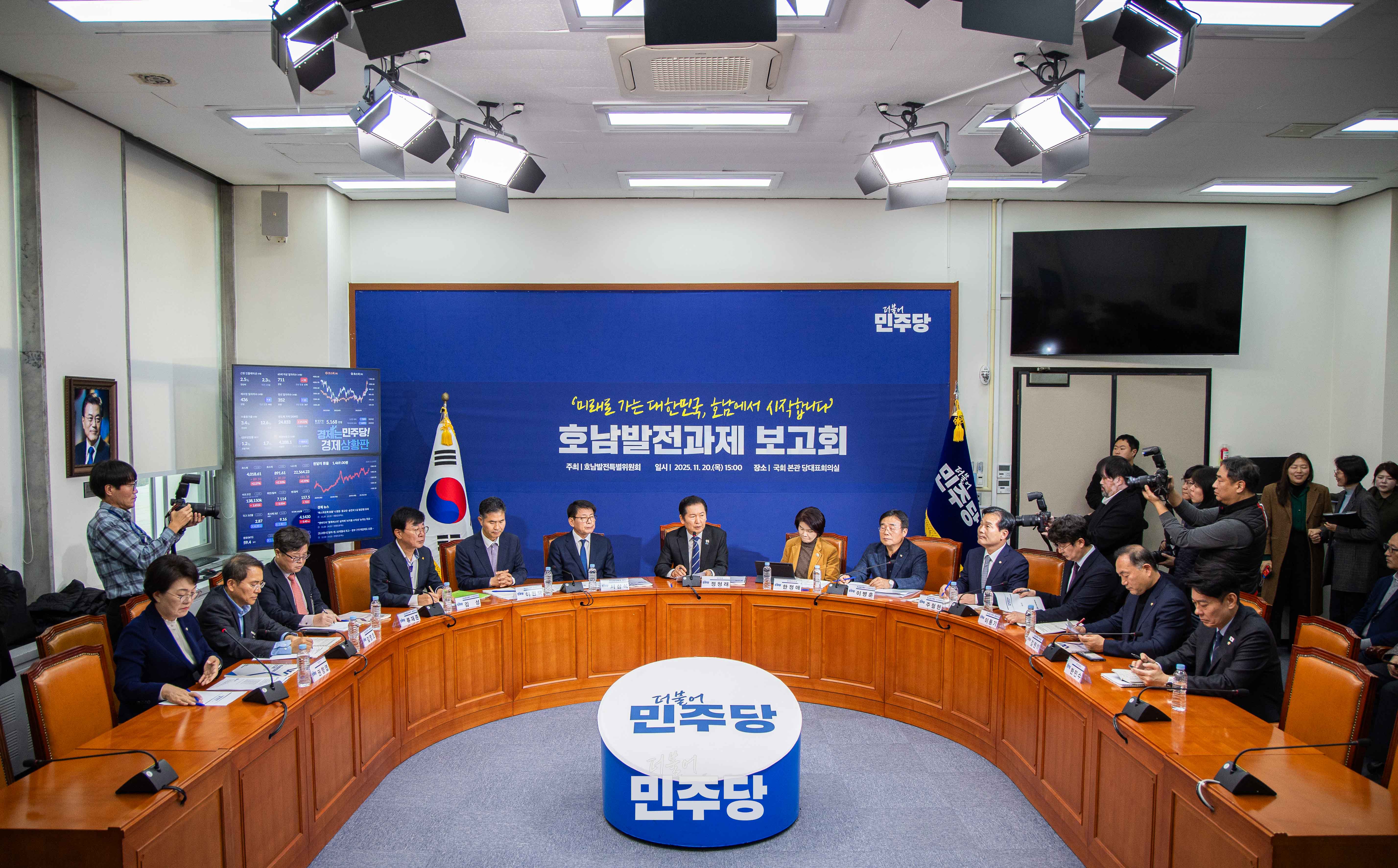 정청래 당대표가 2025.11.20.(목) 국회 본청 당대표회의실에서 열린 호남발전과제 보고회에 참석하여 기념촬영을 하고 있다.