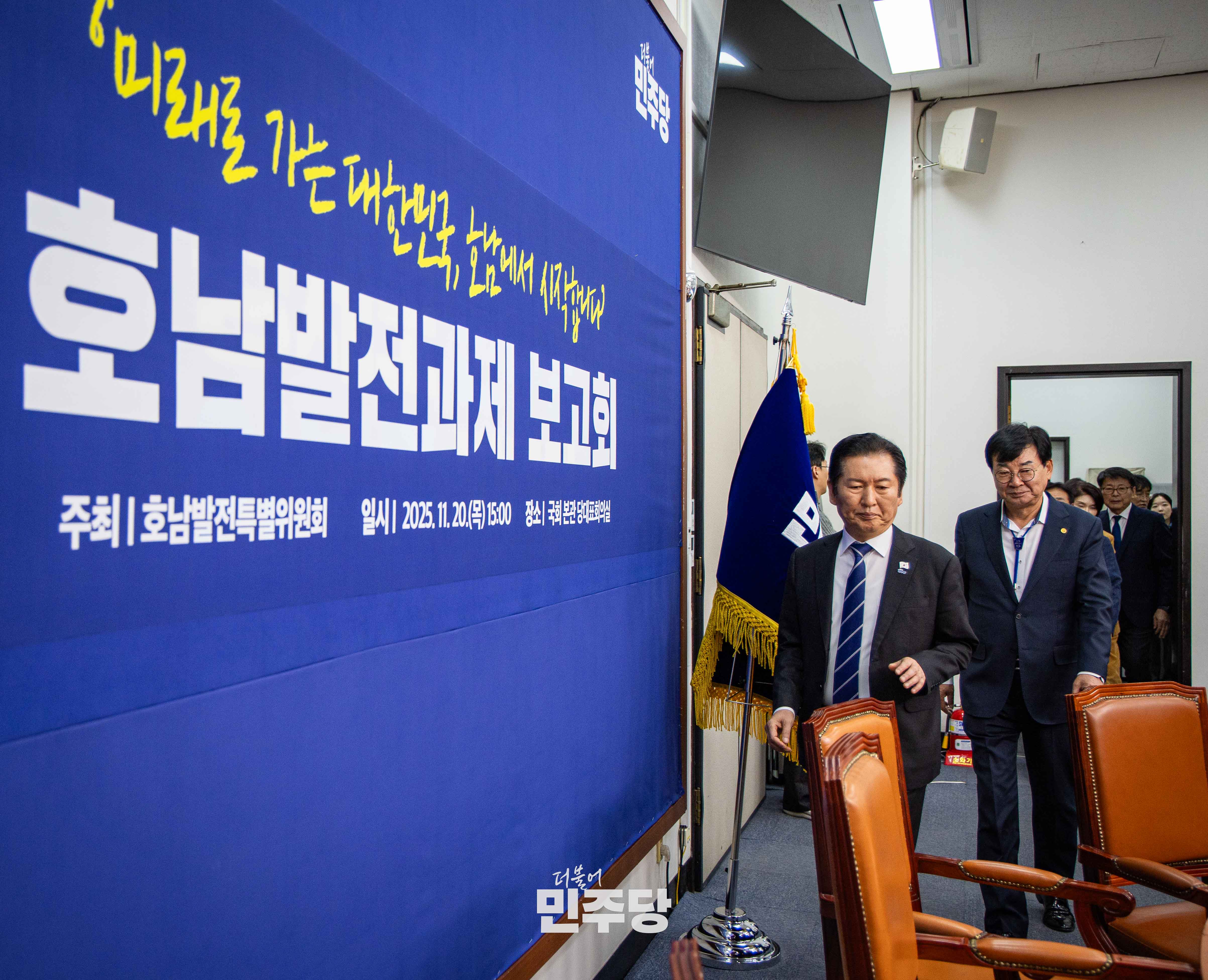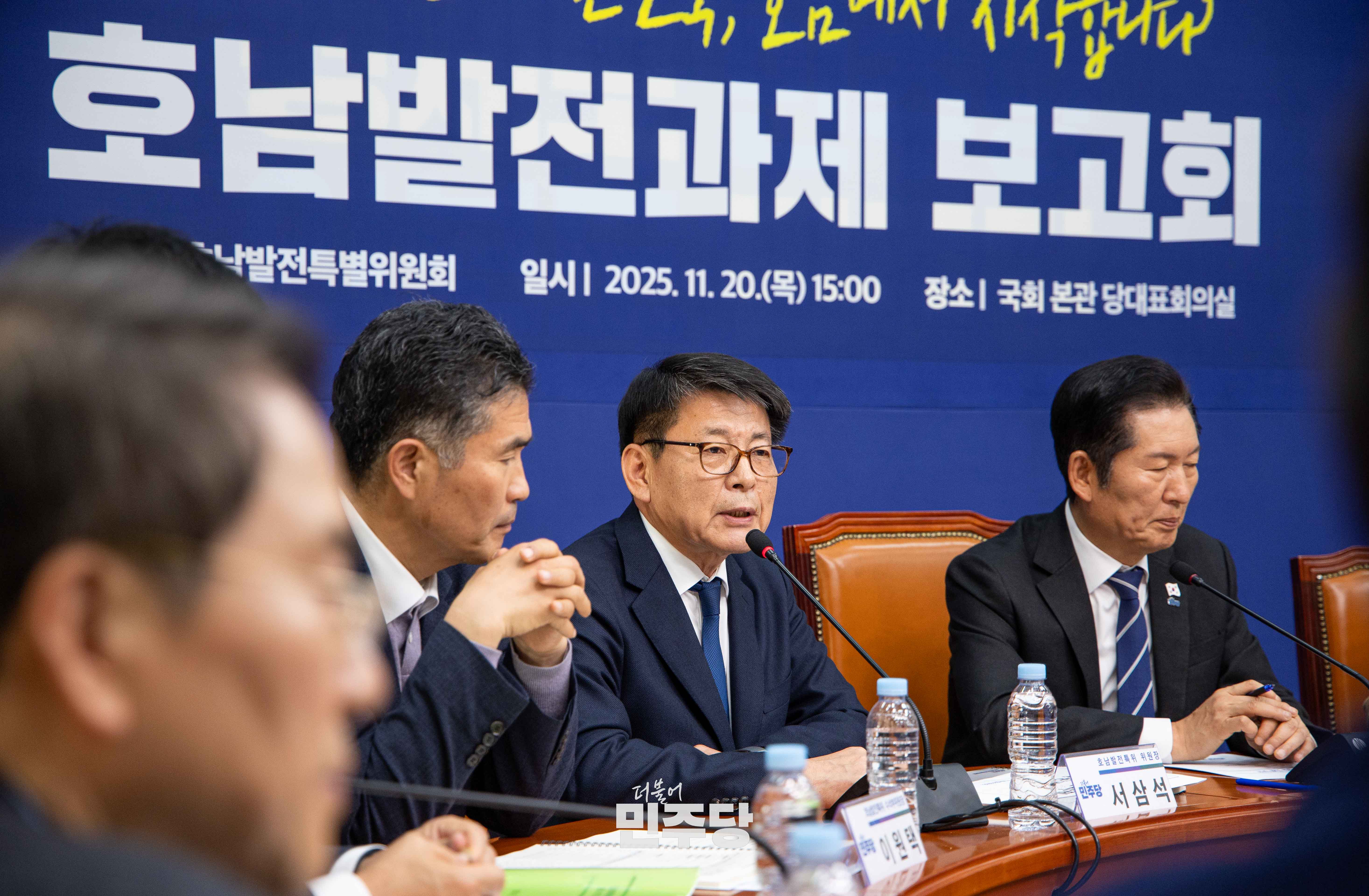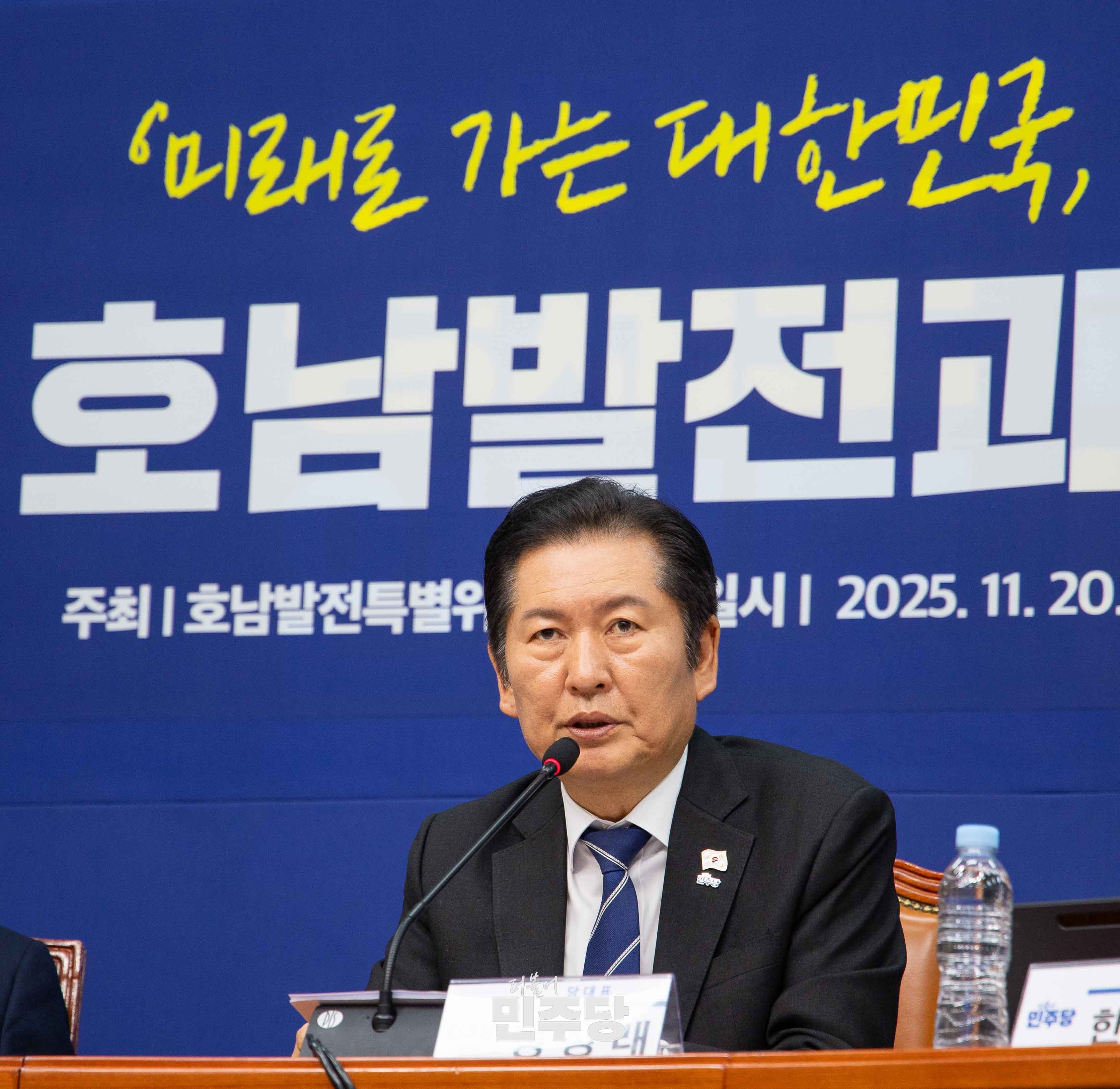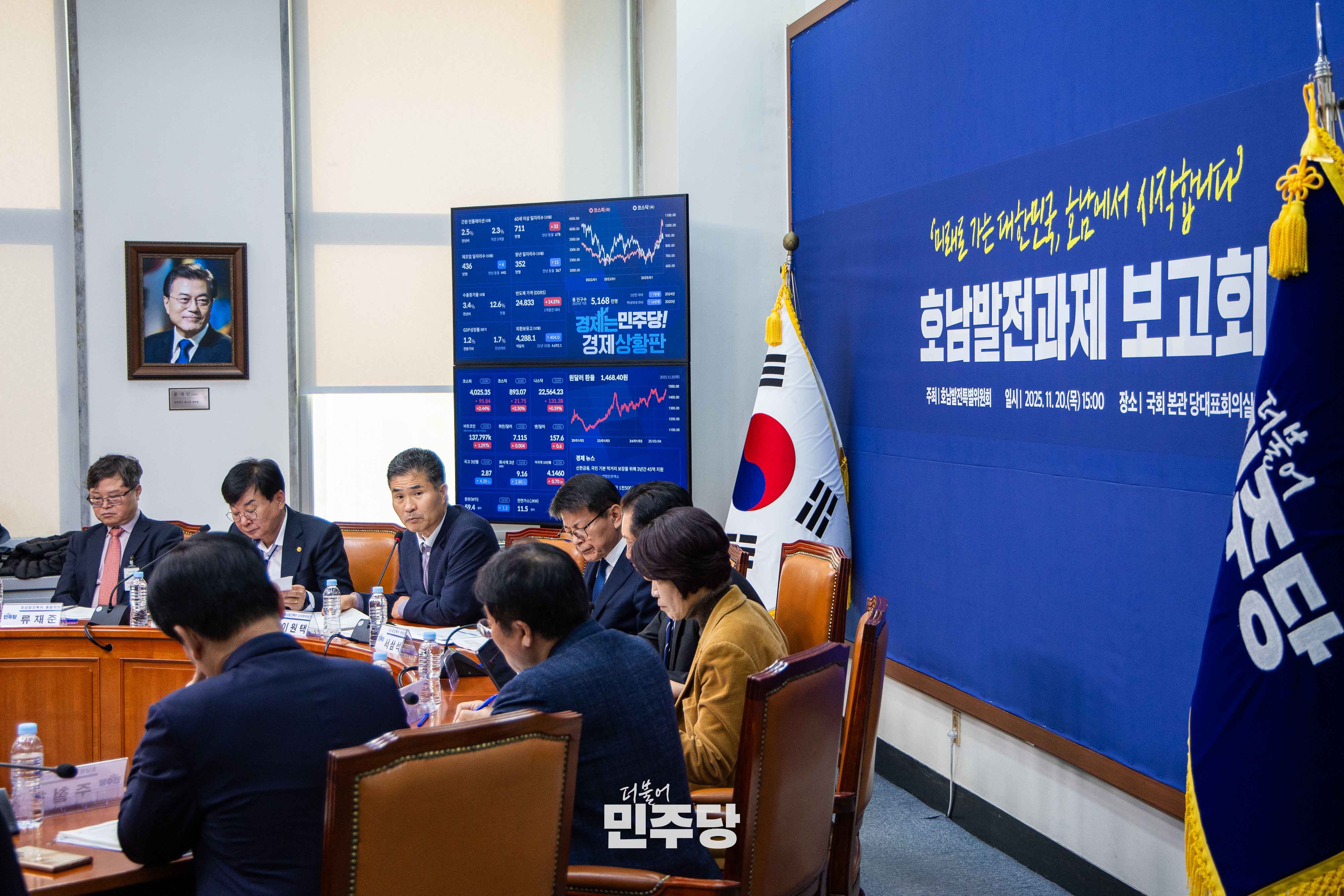 정청래 당대표가 2025.11.20.(목) 국회 본청 당대표회의실에서 열린 호남발전과제 보고회에 참석하여 기념촬영을 하고 있다.