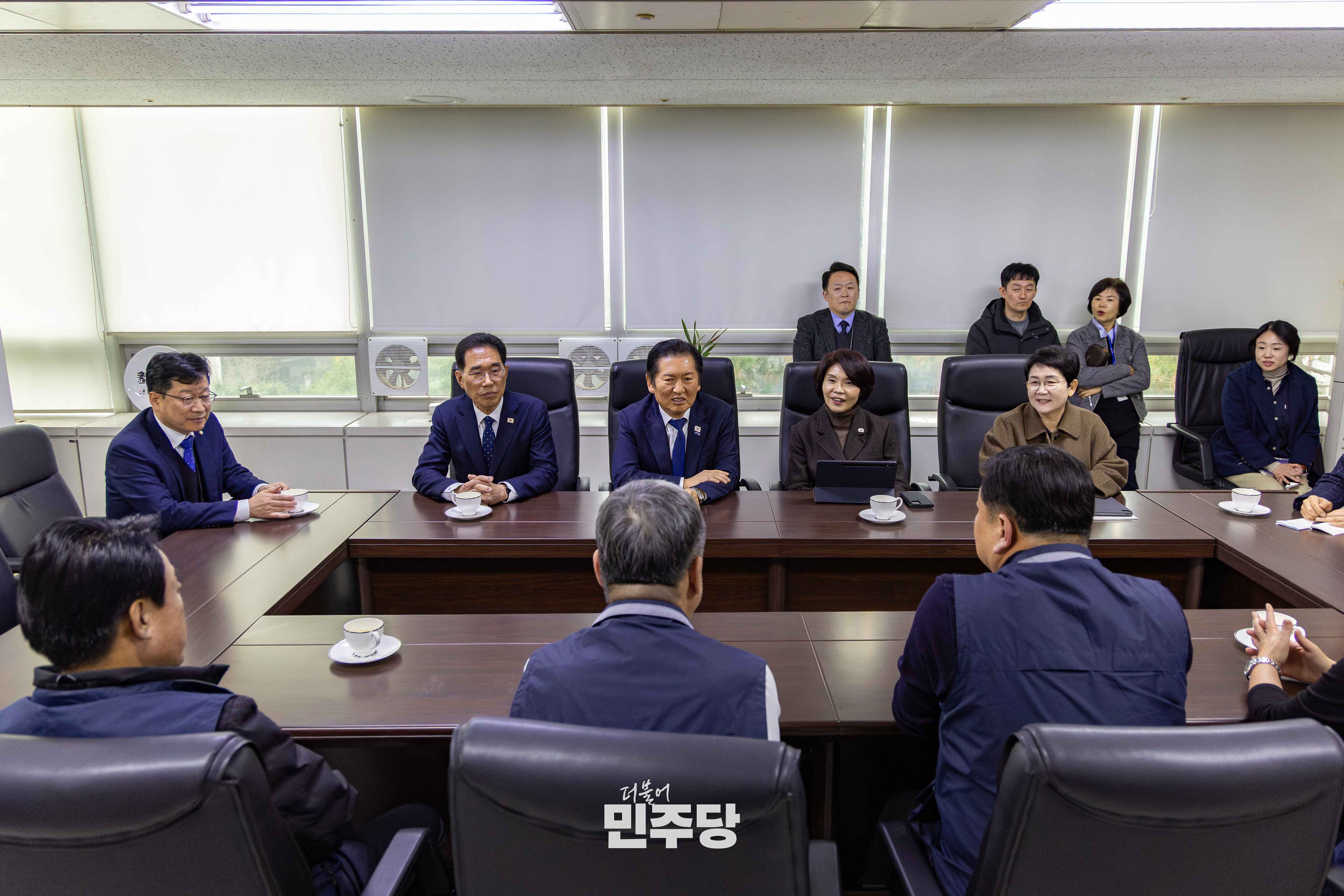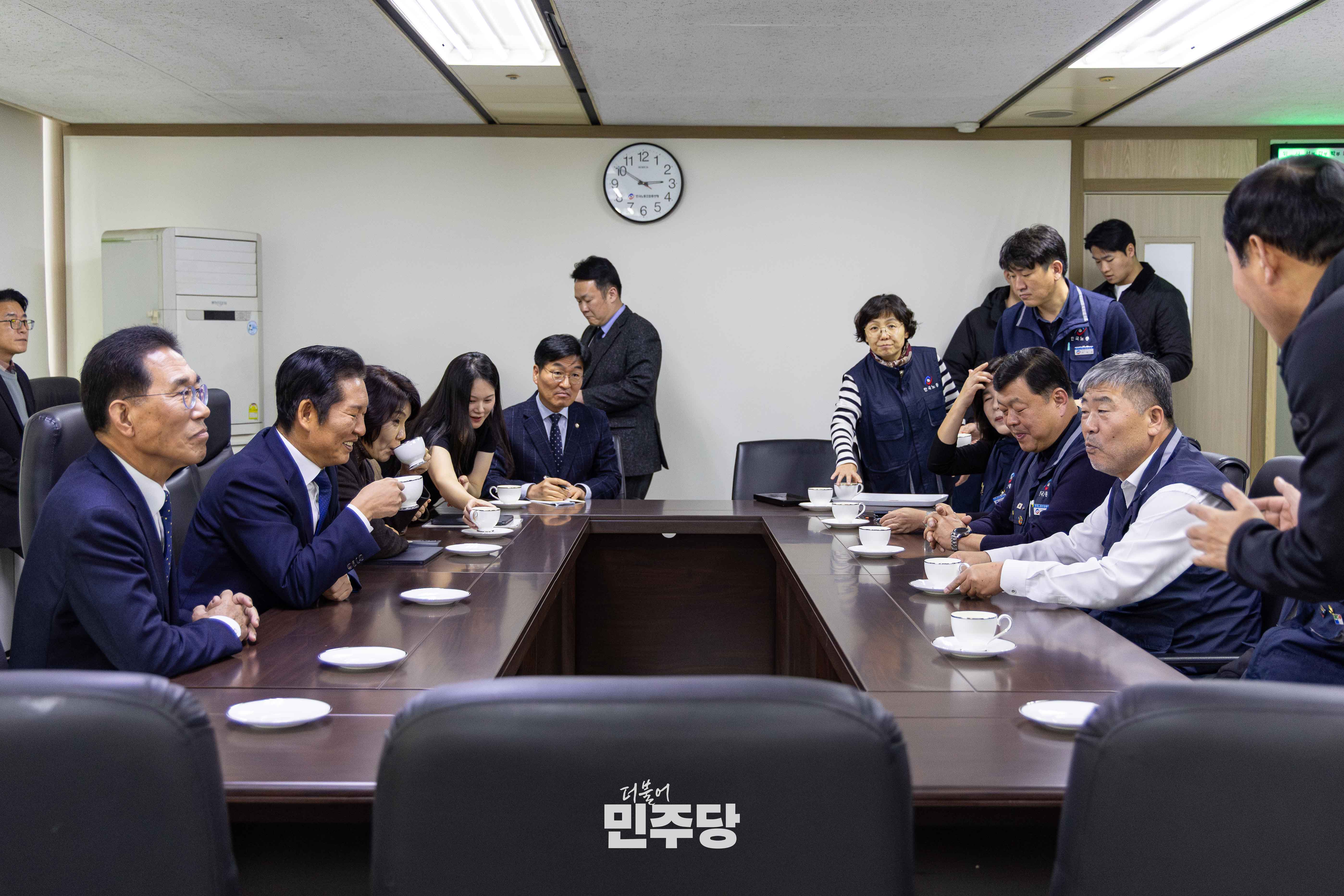정청래 당대표가 2025.11.09.(일) 용인특례시 처인구에 위치한 백암119안전센터에 방문하여 소방관들과 격려하고 간담회를 하고 있다.