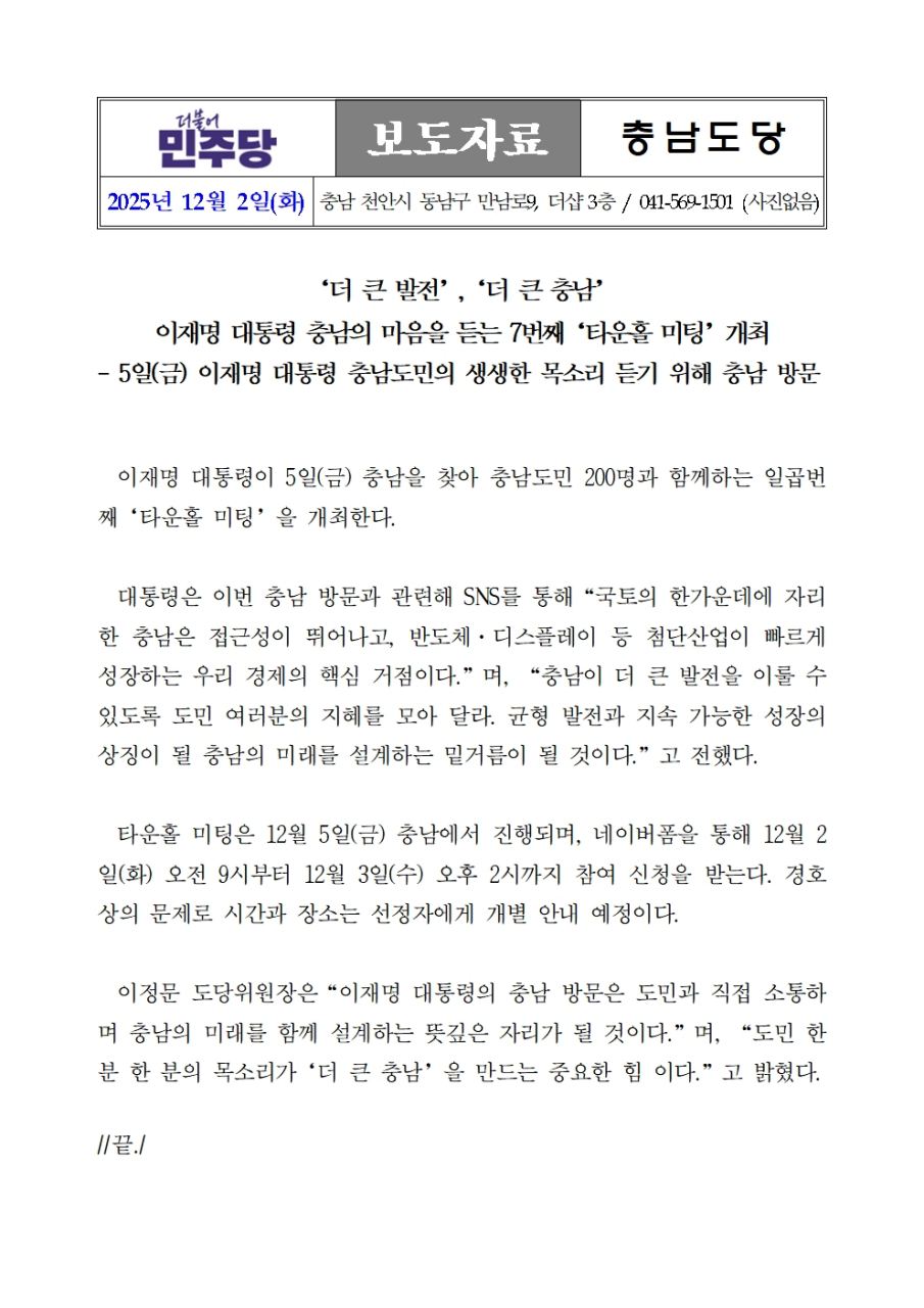 [보도자료] ‘더 큰 발전’,‘더 큰 충남’ 이재명 대통령 충남의 마음을 듣는 7번째‘타운홀 미팅’개최