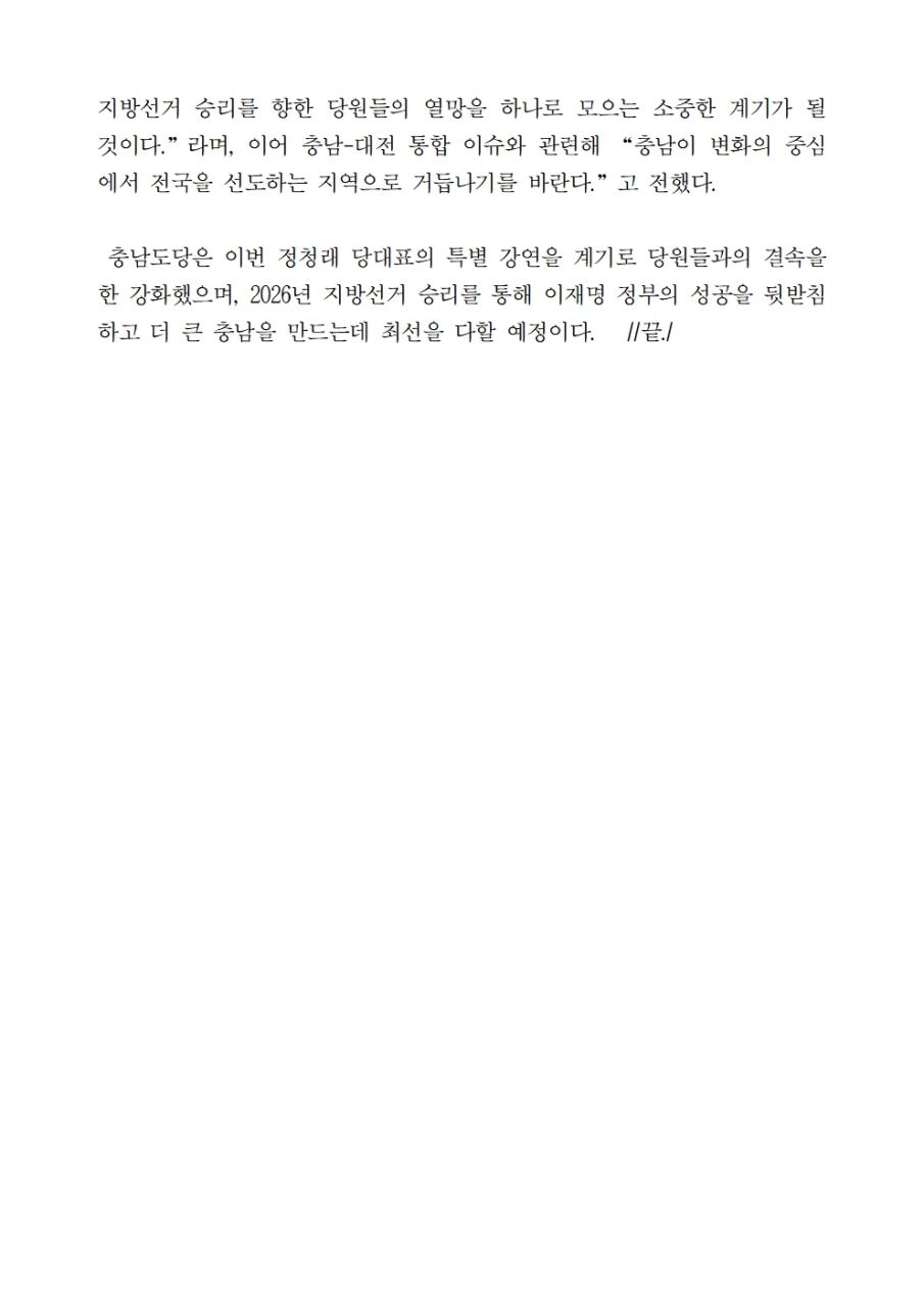 (보도자료) 정청래 민주당 대표 충남 방문, ‘이재명 정부의 정책 방향과 당의 미래 비전 공유’특별 강연 개최