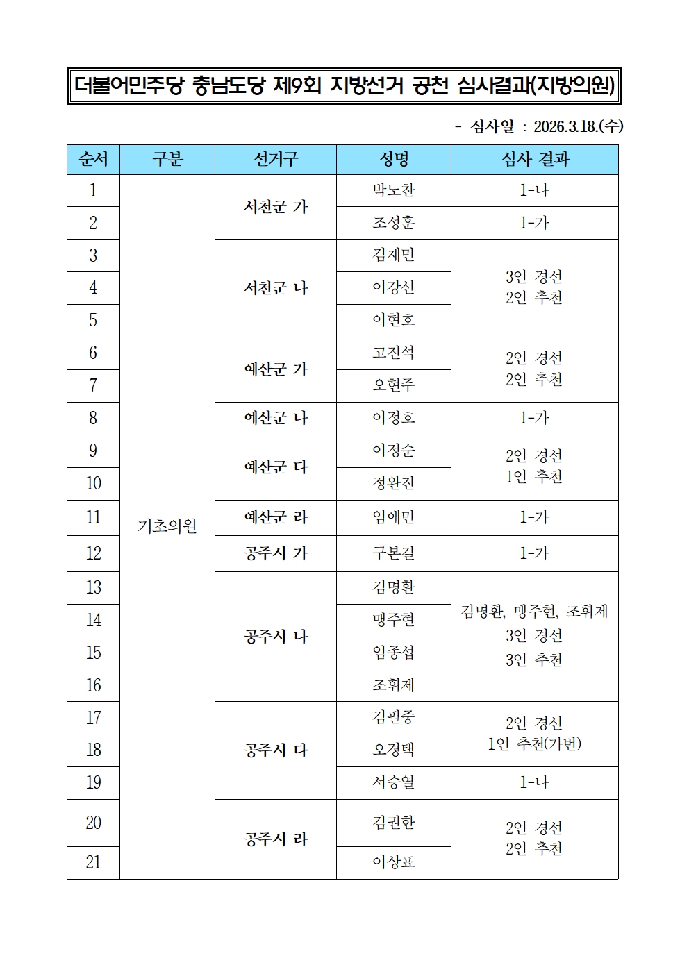 더불어민주당 충남도당 제9회 지방선거 공천 심사결과(기초의원)