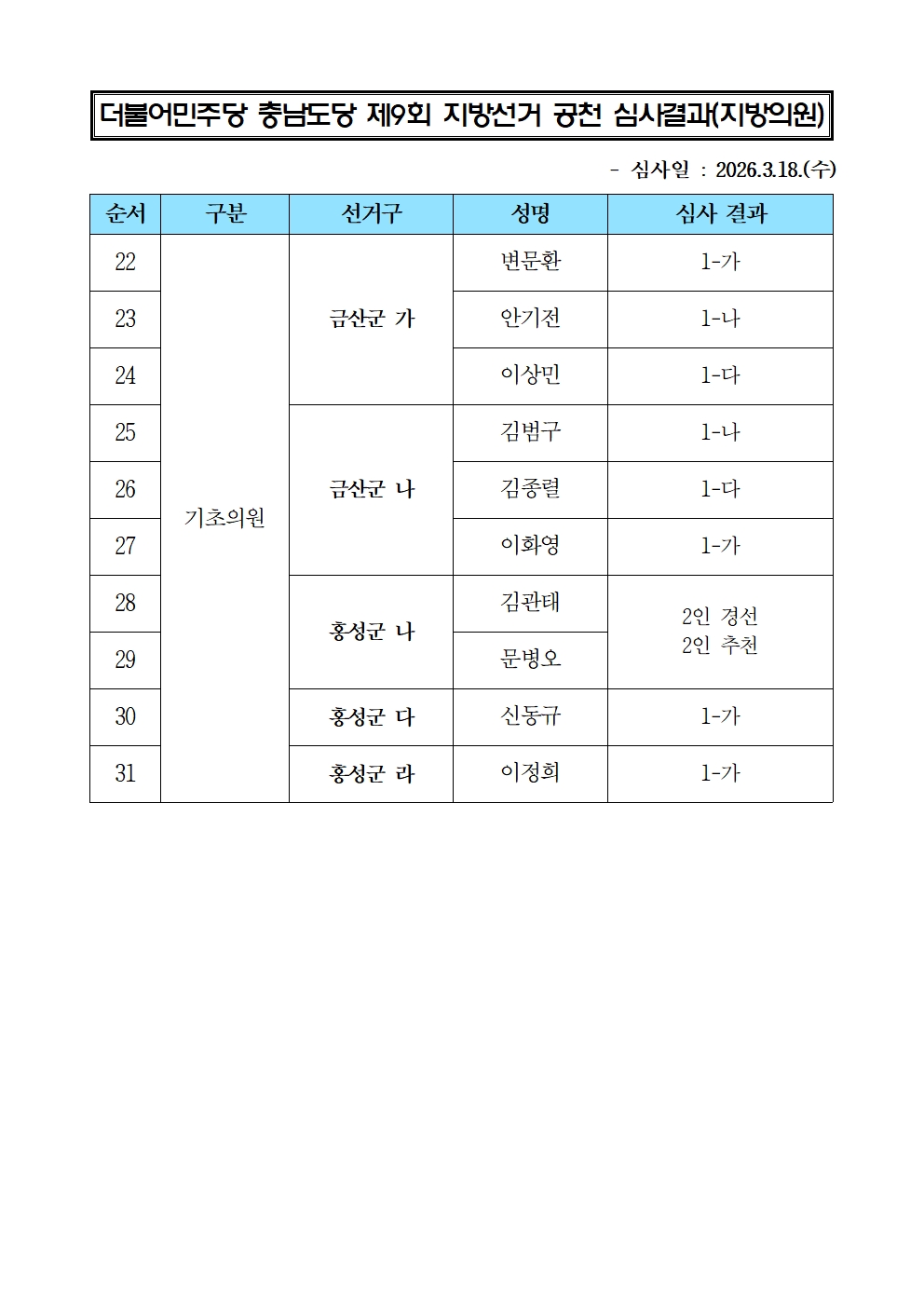 더불어민주당 충남도당 제9회 지방선거 공천 심사결과(기초의원 2차)