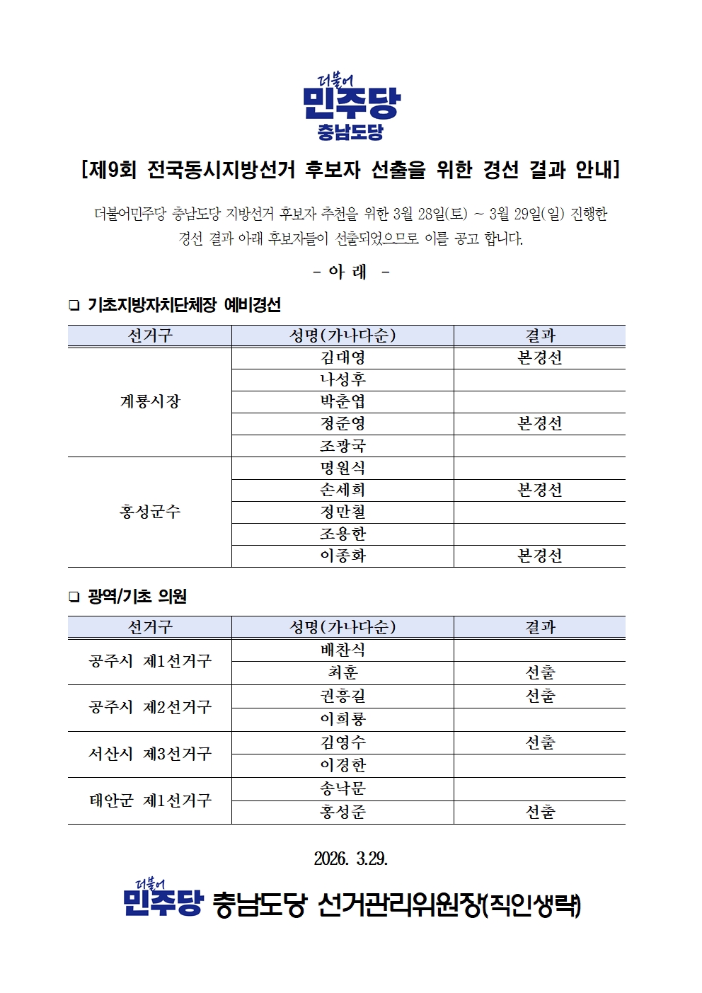 제9회 지방선거 후보자 선출을 위한 경선 결과 안내(3월 28일~29일 결과)