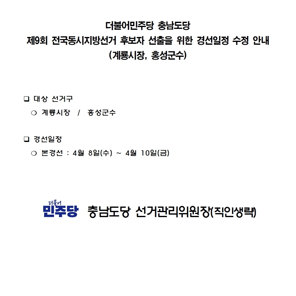 [수정 공지] 제9회 지방선거 후보자 선출을 위한 계룡시장, 홍성군수 본경선 일정 변경 안내