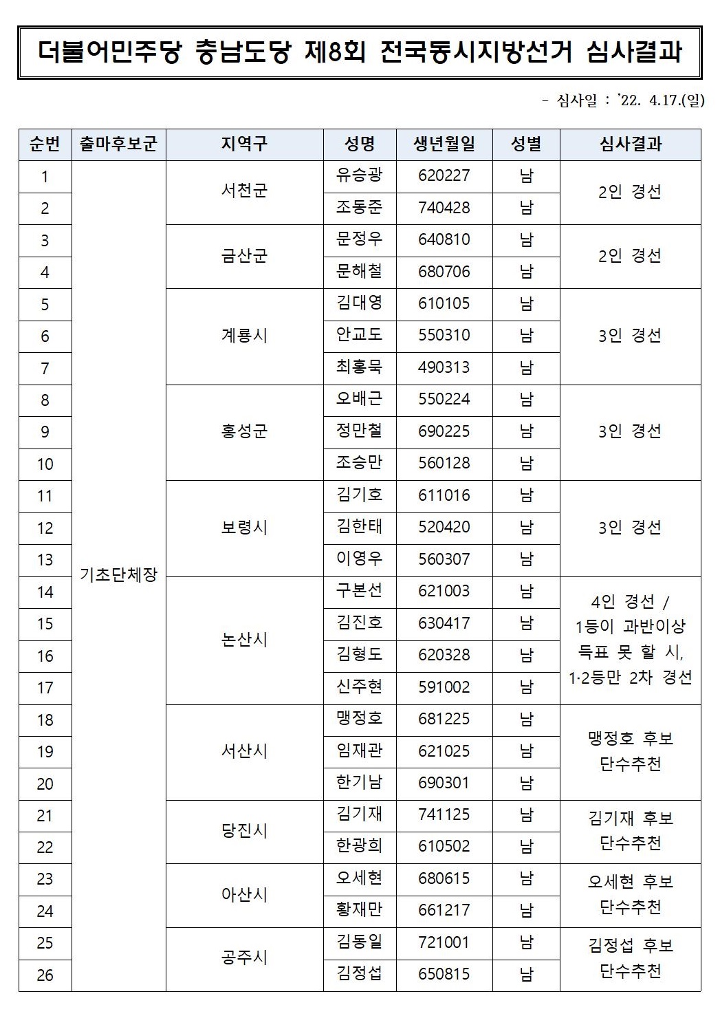 더불어민주당 충남도당 공직후보자추천관리위원회에서 2022년 4월 17일(일)에 실시한 심사면접 결과를 위와 같이 안내해 드립니다.