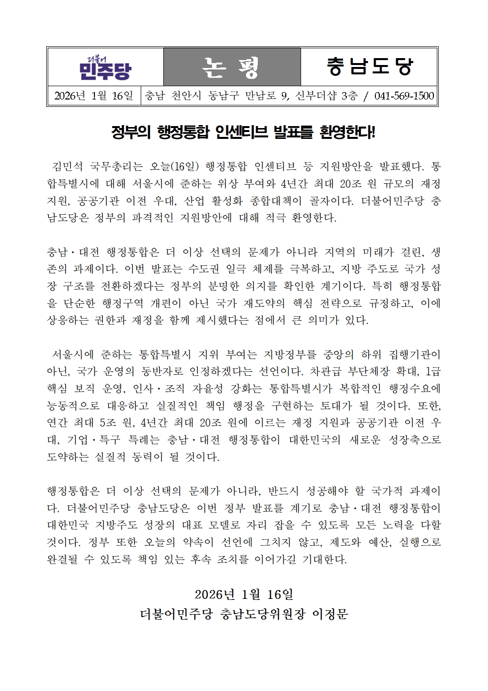(기자회견문) 충남·대전 행정통합, 수도권 1극을 넘어 대한민국 성장축을 바꾸는 선택입니다!